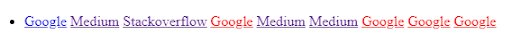}<ul><li><ahref="https://google.com">Google</a><ahref="https://medium.com">Medium</a><ahref="https://stackoverflow.com">Stackoverflow</a><ahref="https://google.com">Google</a><ahref="https://medium.com">Medium</a><ahref="https://medium.com">Medium</a><ahref="https://google.com">Google</a><ahref="https://google.com">Google</a><ahref="https://google.com">Google</a></li></ul>